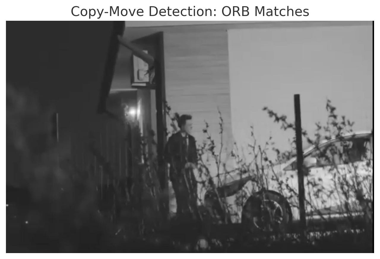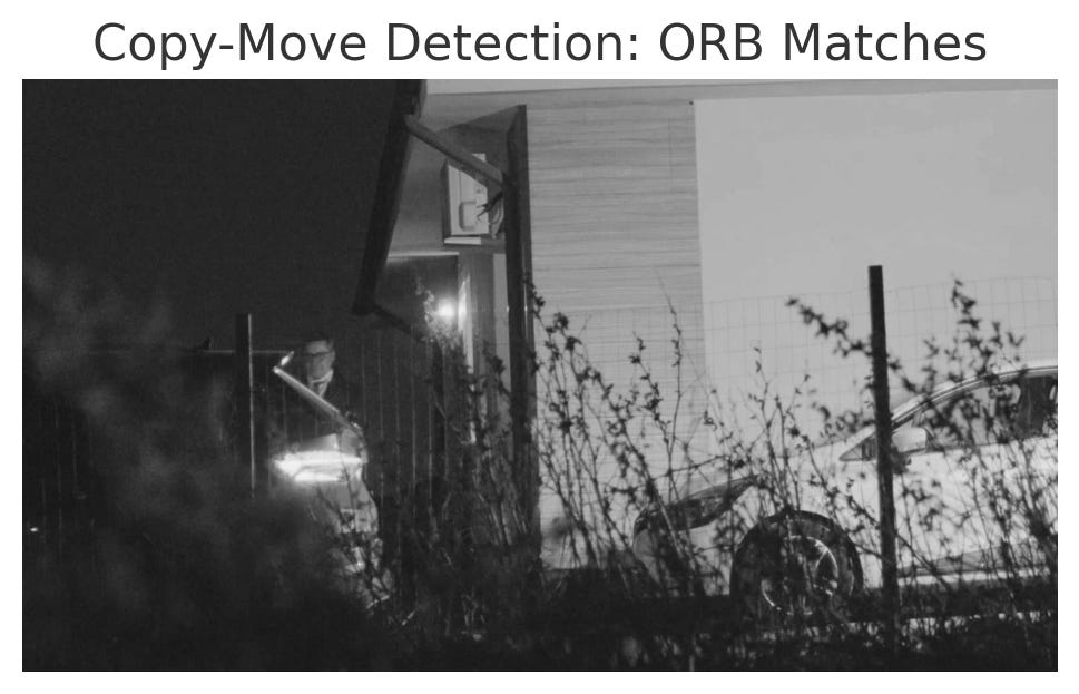 Copy–Move: comparăm caracteristici ORB între regiuni ale aceleiași imagini pentru a găsi copii interne.