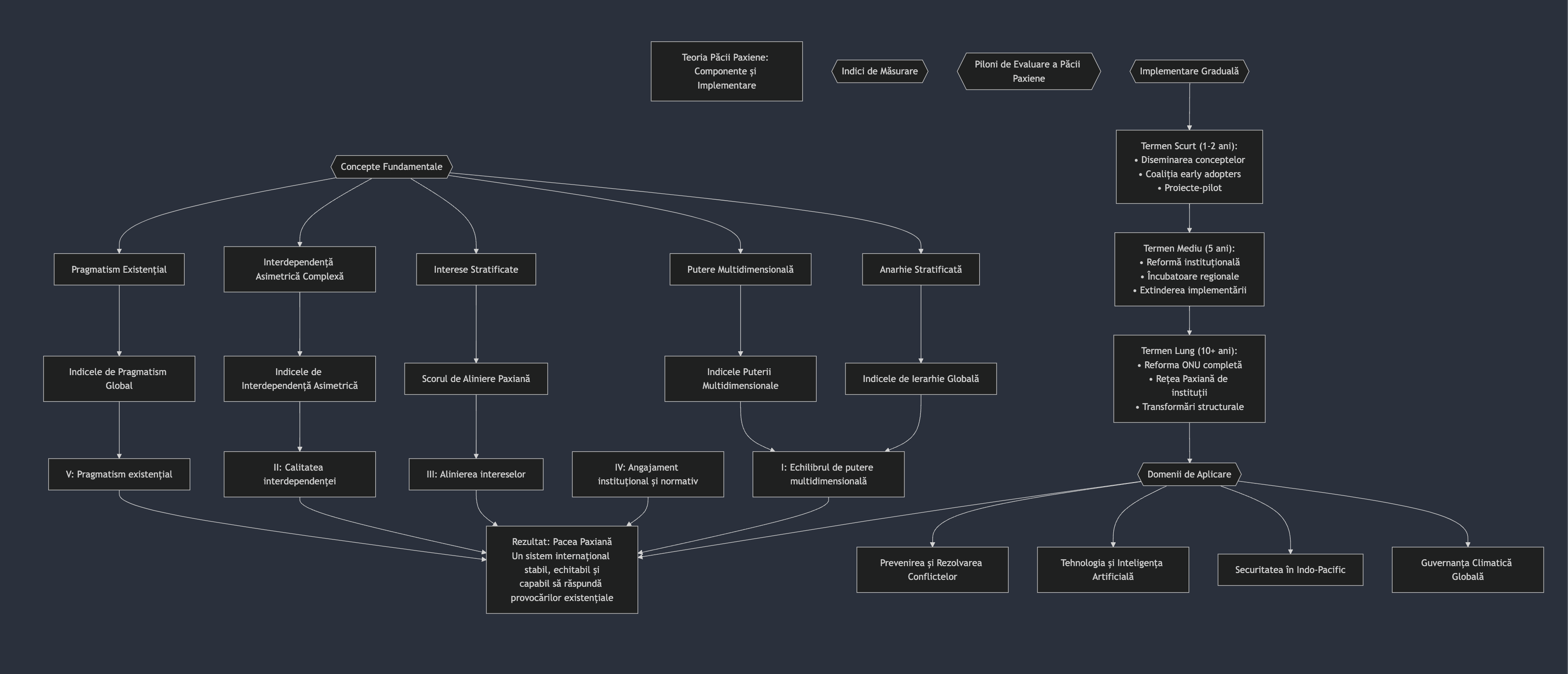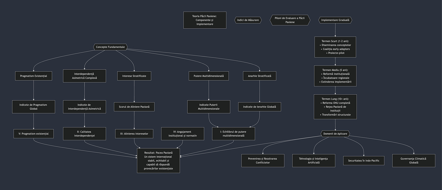 Tranziția de la paradigma actuală (adesea caracterizată drept un amestec de ordine liberală incompletă și reveniri la realpolitik) către Pacea Paxiană nu poate fi decât un proces treptat, strategic, care să implice atât viziune pe termen lung, cât și pași concreți pe termen scurt și mediu. În această secțiune, elaborăm un plan de implementare graduală a teoriei, structurat pe intervale: scurt (1-2 ani), mediu (5 ani) și lung (10+ ani). Vom identifica potențialii „early adopters” – actori statali sau nestatali care ar putea prelua inițiativa – și vom sugera proiecte-pilot prin care principiile Paxiene să fie testate în practică. De asemenea, vom propune indicatori de succes și metode de evaluare, pentru a monitoriza progresul în direcția obiectivelor Paxiene.